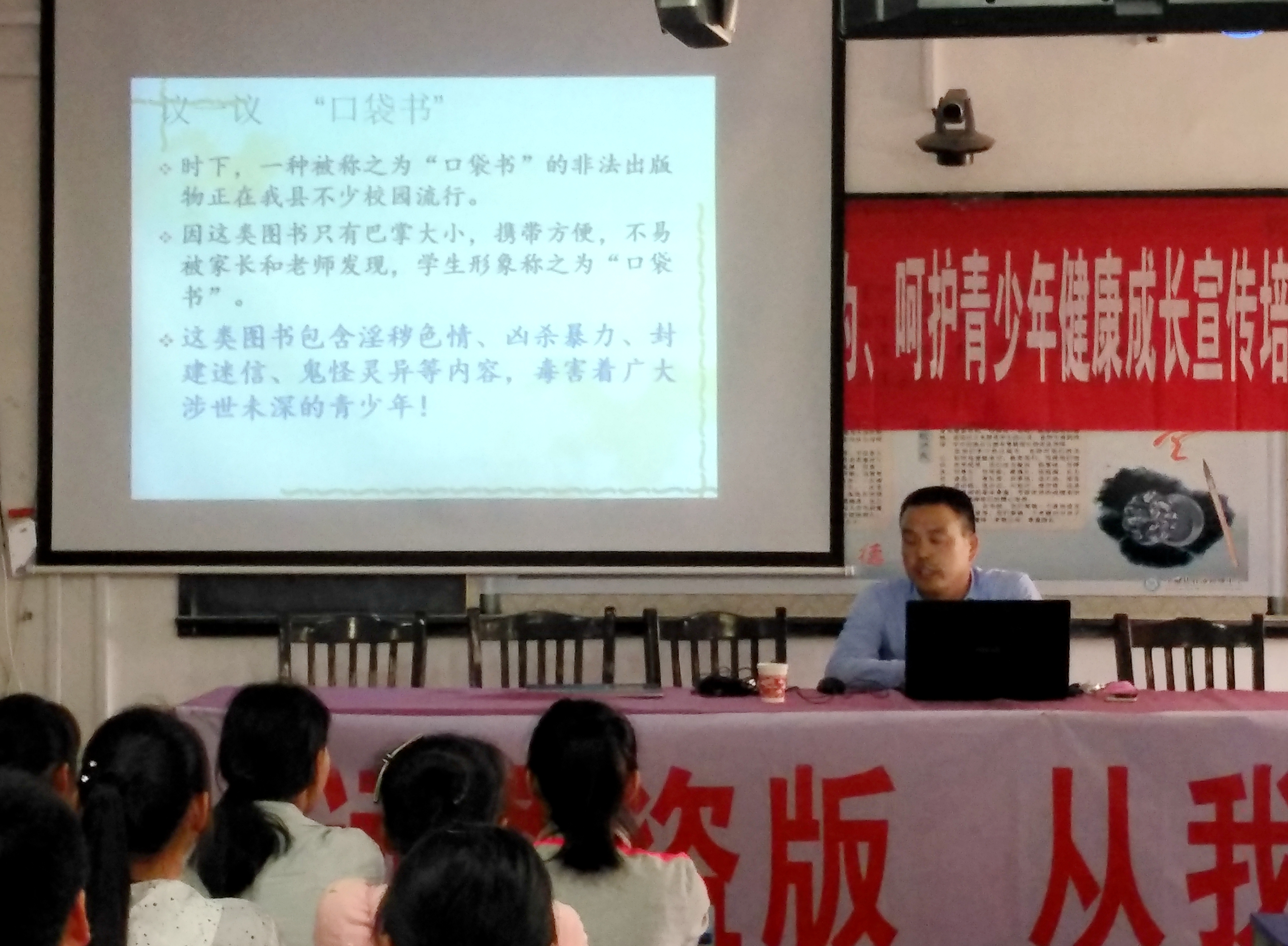 韓學梅為此次活動做了動員講話。全椒縣文化市場執(zhí)法隊鄒國鋒從專業(yè)的角度并結(jié)合身邊的實事進行了精彩的授課。課上分別從口袋書的危害、網(wǎng)絡(luò)陷阱、如何保護個人隱私、遠離不良信息、怎樣防范網(wǎng)絡(luò)詐騙和網(wǎng)絡(luò)欺凌,以及如何抵制盜版出版物等一系列問題,進行了生動詳盡地闡述。同學們在認真聆聽的同時,不時發(fā)出驚嘆和深思。