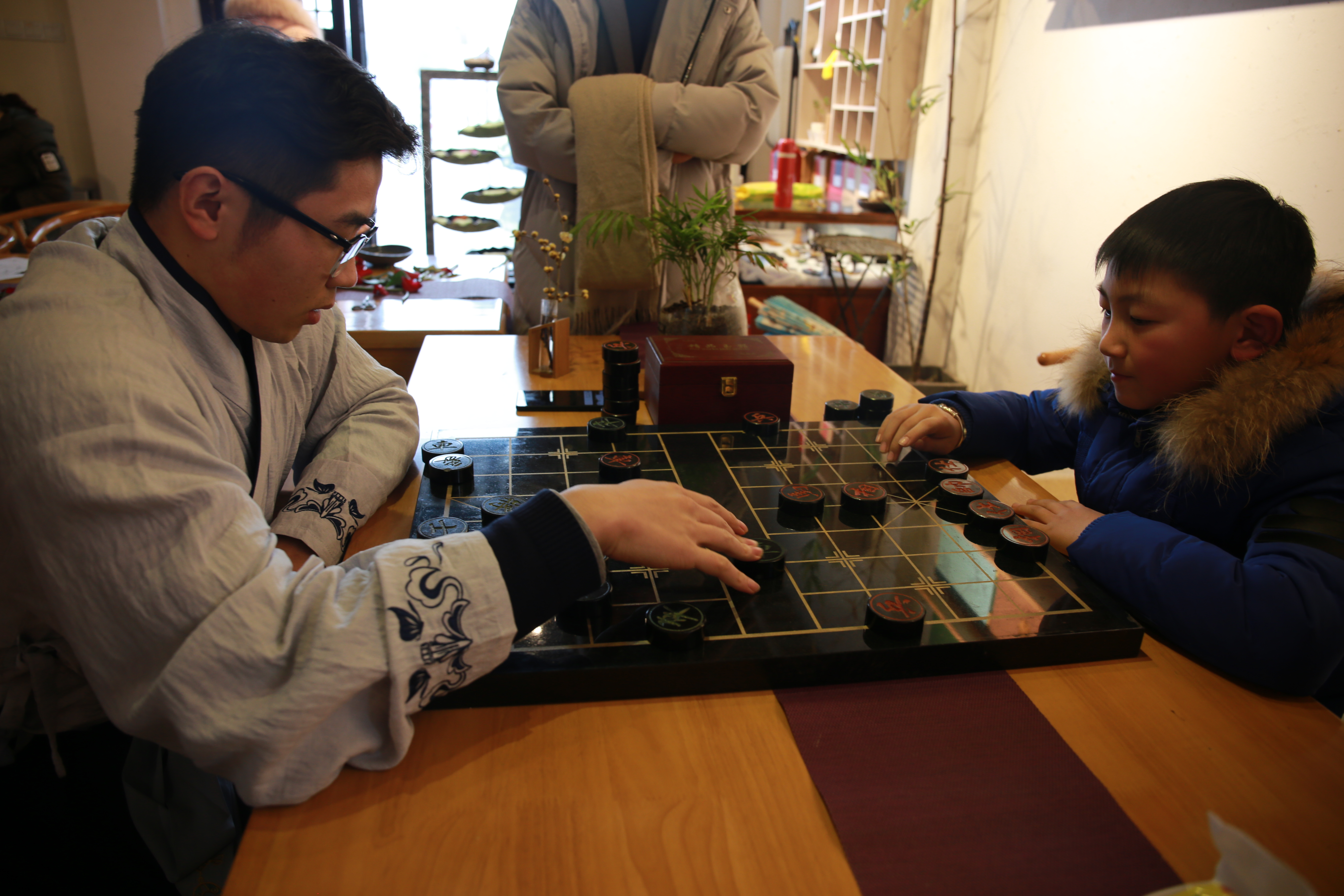 活動在太平文化廣場藏歲茶空間舉辦。由老師給小朋友們分別介紹古人的娛樂生活方式,并分頭帶著小朋友們逐一體驗斗棋、品茗、插花、古箏、作畫。屋外北風勁吹,雪花輕飄,屋內(nèi)開心歡快,熱情難奈。孩子們或孝子奉茶,安靜茗品,或成竹在胸,冷靜博弈,或一撇一捺,沉靜書畫,在不同的體驗中,覺知中國古代文人墨客謙謙君子大美的人文情懷;大人們摩拳擦掌只想做回青春少年,幾乎都忘了回家的時間。