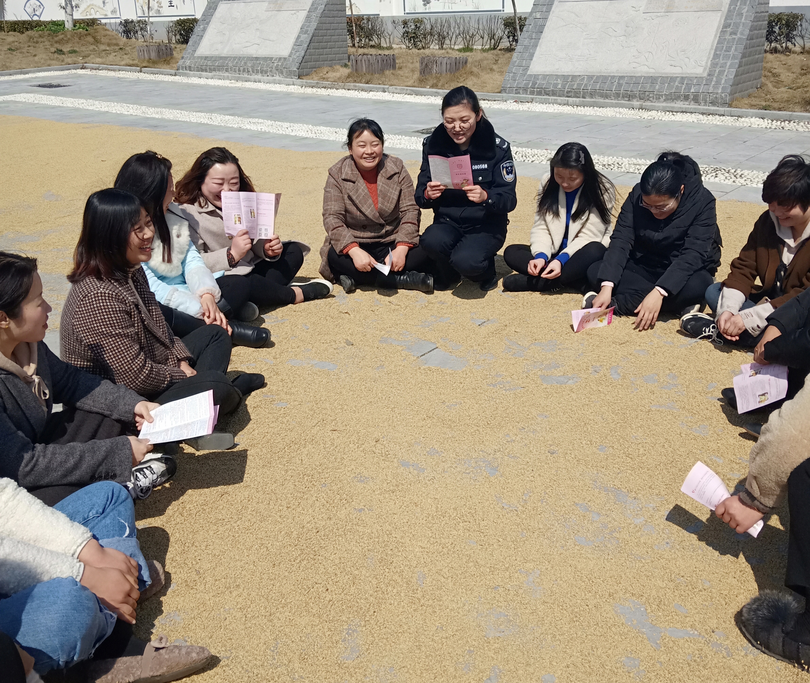活動現(xiàn)場,司法所工作人員向在場的婦女同胞發(fā)放了婦女維權宣傳手冊和《反家庭暴力法》、《婦女權益保障法》等法治宣傳資料。前來咨詢的婦女群眾較多,為了讓大家能夠有序的進行咨詢,石沛鎮(zhèn)司法所副所長羅圣娟召集前來咨詢的婦女同胞們在附近的曬稻場上席地而坐,大家圍成一圈,按照順序一個個講述自己在生活或者工作中遇到的法律問題。有的咨詢家庭暴力方面問題,有的咨詢離婚后財產分割問題,還有的咨詢孩子撫養(yǎng)權問題,羅圣娟都耐心地進行了解答。