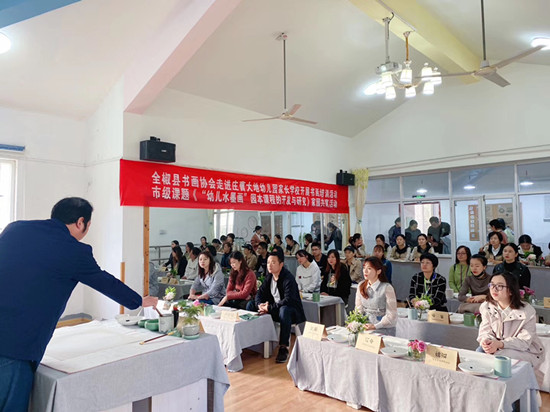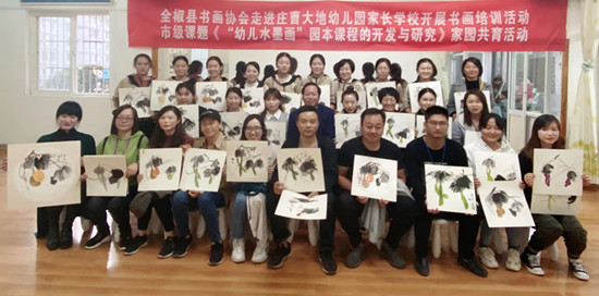 11月1日,全椒縣書畫協(xié)會文藝志愿者走進(jìn)莊曹大地幼兒園,為學(xué)校20多名老師及家長進(jìn)行現(xiàn)場書畫教學(xué)。縣書畫協(xié)會主席黃云應(yīng)邀授課,從執(zhí)筆、繪畫基礎(chǔ)開始教學(xué),讓廣大老師及家長感受中國水墨畫的無窮魅力。