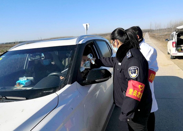 2月17日,全椒縣社區(qū)矯正工作者在檢測(cè)點(diǎn)為來往車輛和姓測(cè)量體溫。