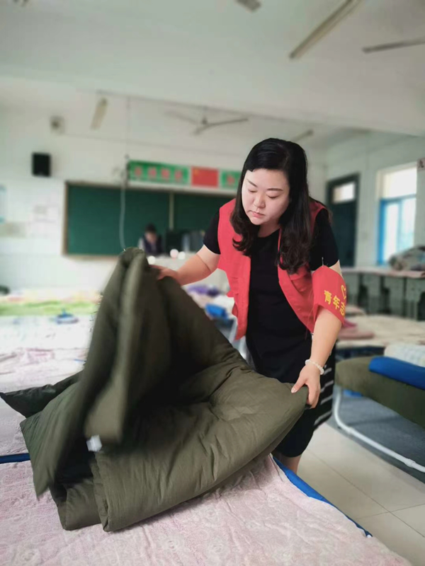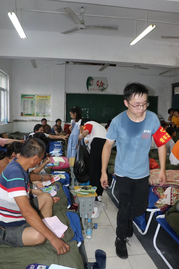7月20日,隨著汛情發(fā)展,很多群眾撤離到安置點(diǎn),鎮(zhèn)村干部同時(shí)投入一線防汛,后方人力緊缺。團(tuán)縣委發(fā)布緊急招募信息,為古河鎮(zhèn)安置點(diǎn)組織青年志愿者入駐,負(fù)責(zé)后勤服務(wù)和心理疏導(dǎo)。當(dāng)天,17名青年志愿者接龍報(bào)名,當(dāng)天下午,4名駐夜志愿者上崗。隨后的每一天,一批批青年志愿者自駕或拼車,趕赴古河中學(xué)安置點(diǎn),在團(tuán)縣委駐點(diǎn)人員的安排下,投入崗位服務(wù)。