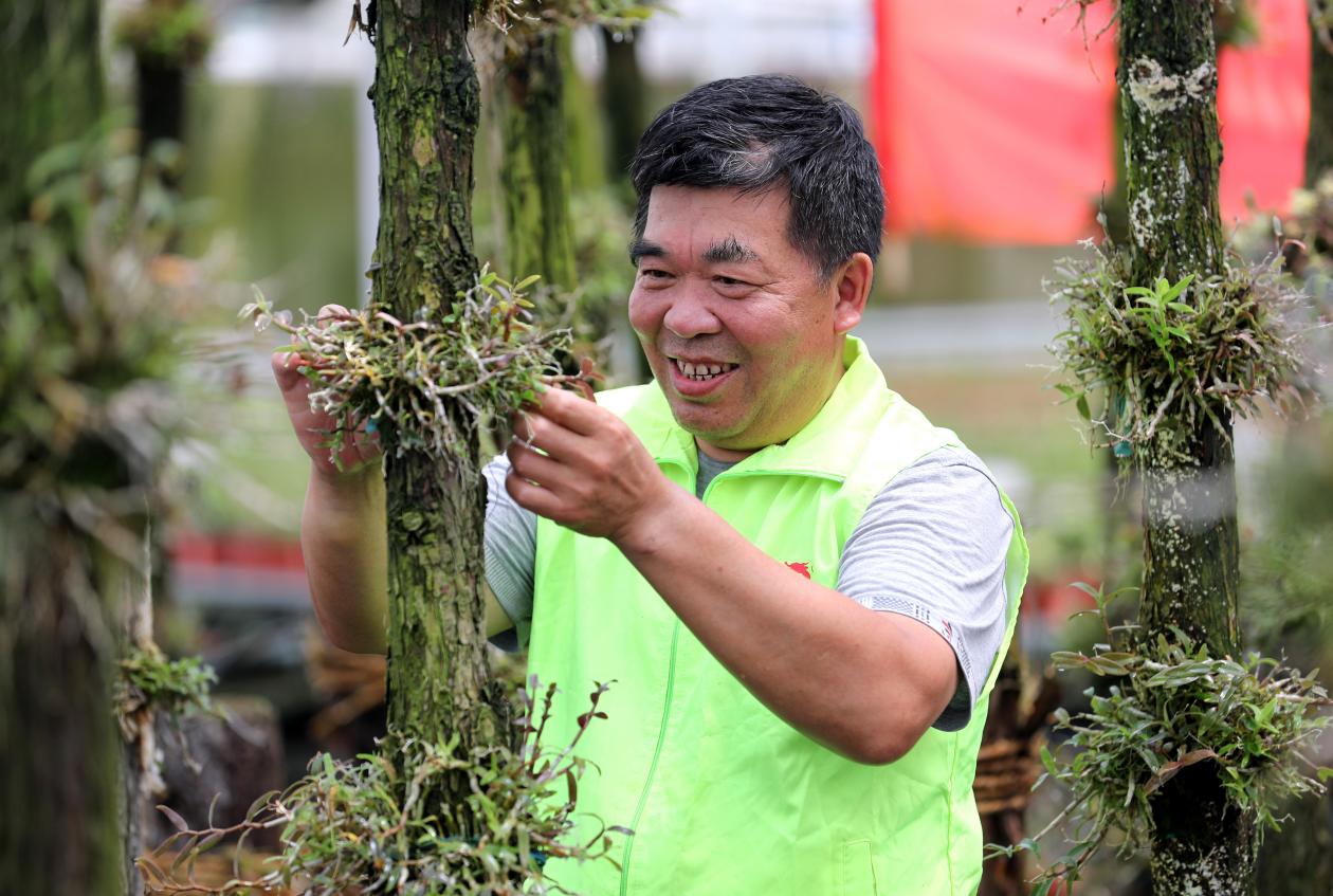 全椒縣牧龍山鐵皮石斛產(chǎn)業(yè)園,村民在管護(hù)原木種植的鐵皮石斛。沈果攝