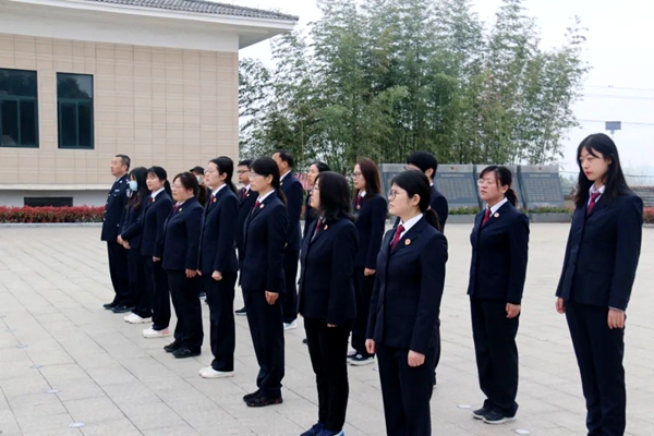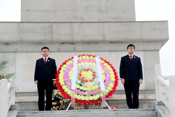 在周家崗烈士陵園,全體干警向英烈默哀,干警代表向革命英烈敬獻(xiàn)花籃。