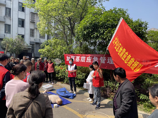 講座活動結(jié)束后,大家一起來到水上新村小區(qū)進行地震應急疏散演練。活動中,演練信號共播放兩次,第一次表示地震發(fā)生,要求就地避震,第二次表示地震已過,要求居民有序撤離至小區(qū)空曠中心。疏散演練結(jié)束后,由紅十字會向居民介紹了海姆立克急救法、心肺復蘇的動作要領(lǐng)。