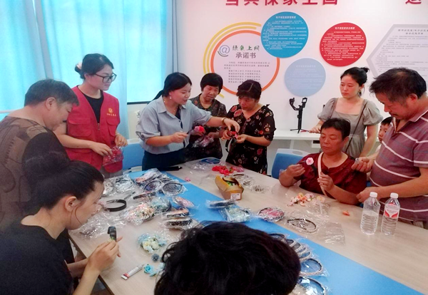 居民紛紛動(dòng)手投入到簪花制作中,選擇自己喜歡的顏色,點(diǎn)綴一個(gè)個(gè)色彩艷麗的古風(fēng)簪花作品。